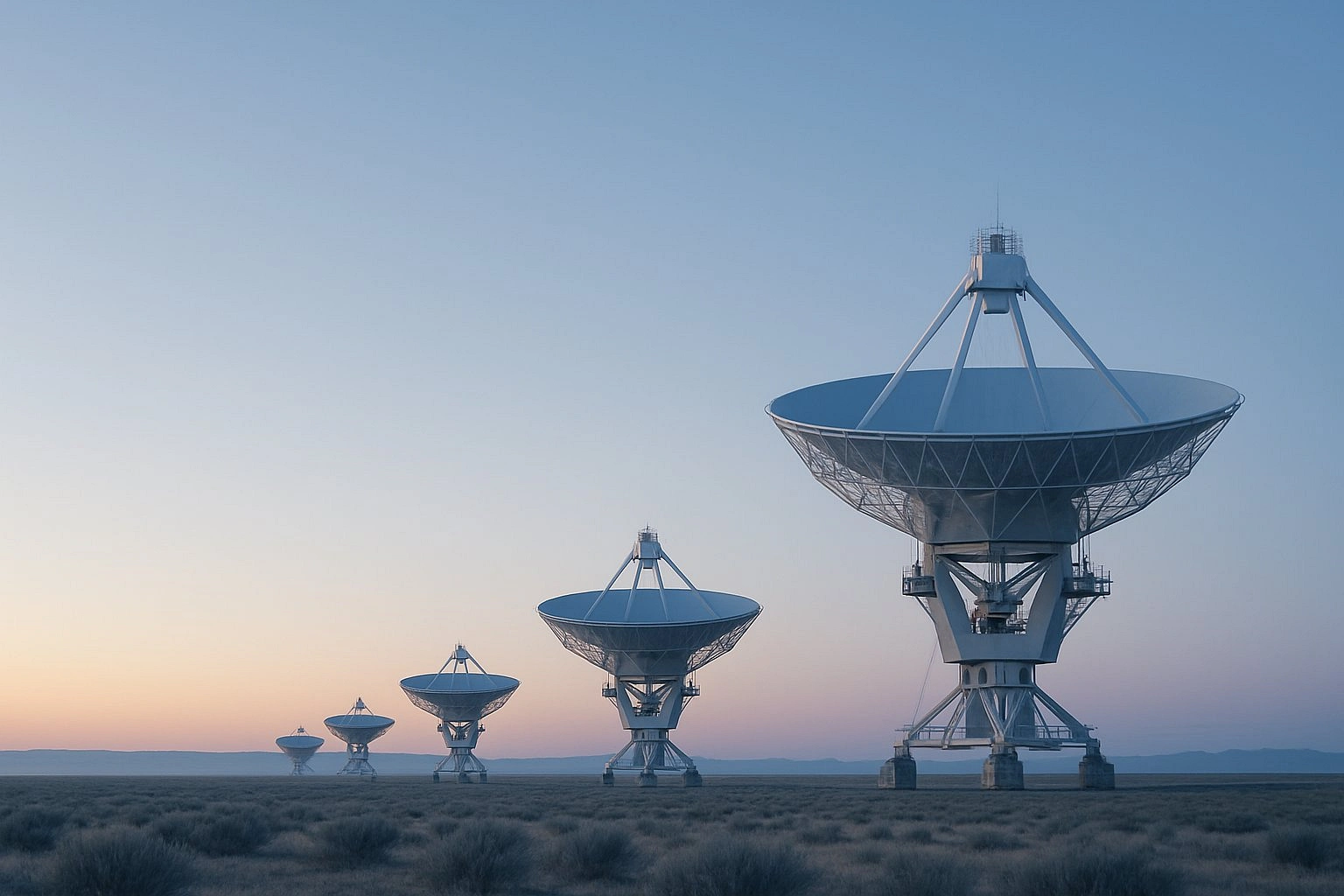 Low-frequency radio telescope array under a twilight sky with satellite trails overhead